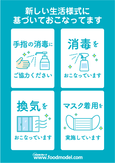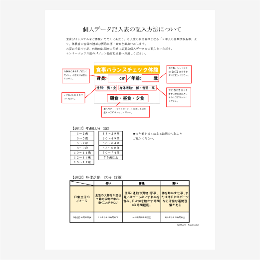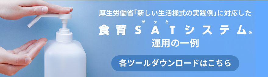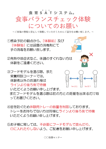 厚生労働省より発表された『新しい生活様式の実践例』に基づき、食育SATシステムを使った食事バランスチェック(体験型栄養指導)について、運営をされる方をはじめ、指導者も体験者も皆様が安心して実施していただけるよう、設置・運用・事後の手入れなど、具体的な運用の一助として活用できる各種データを無料でダウンロードできます。組み合わせてご自由にご使用ください。