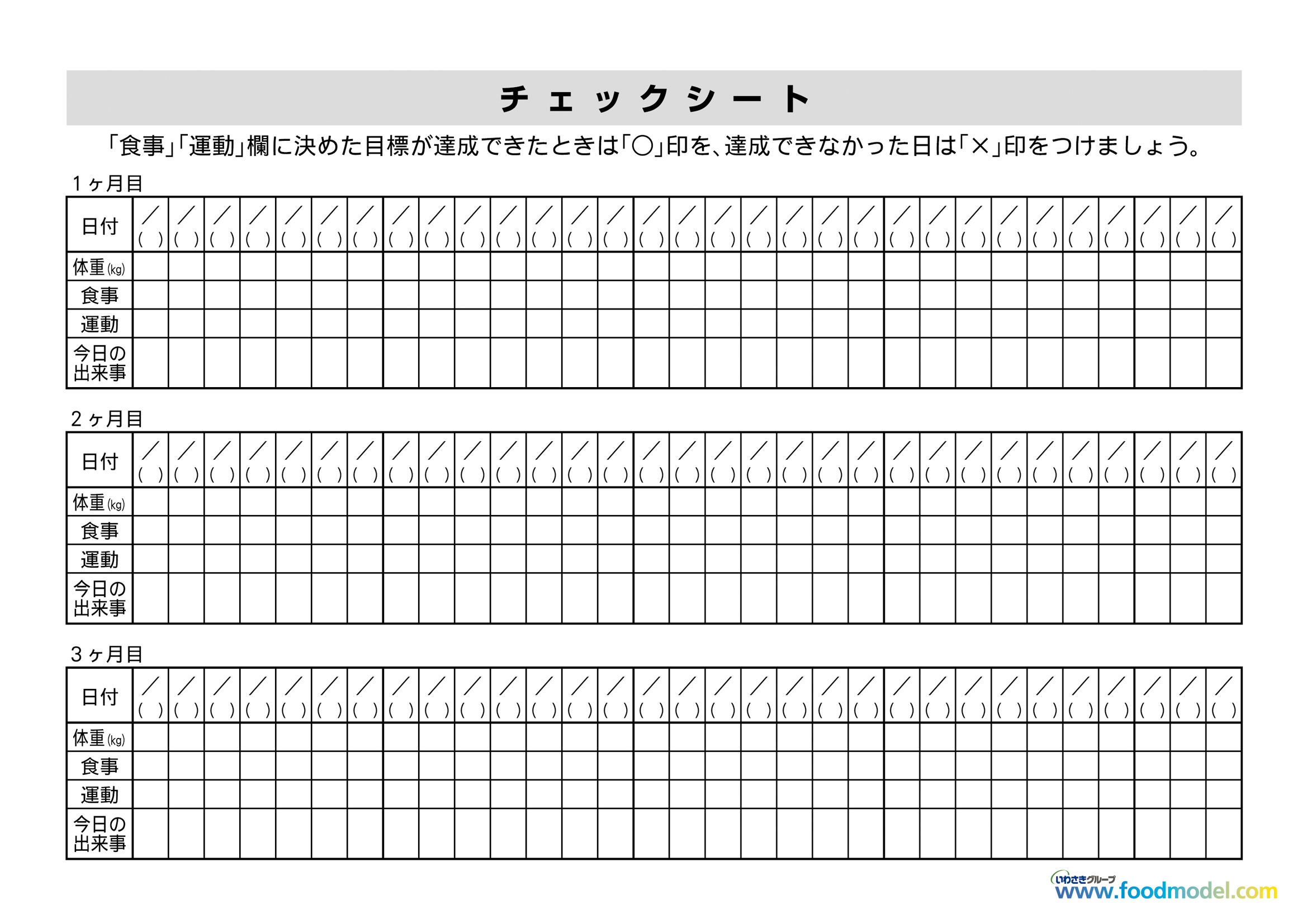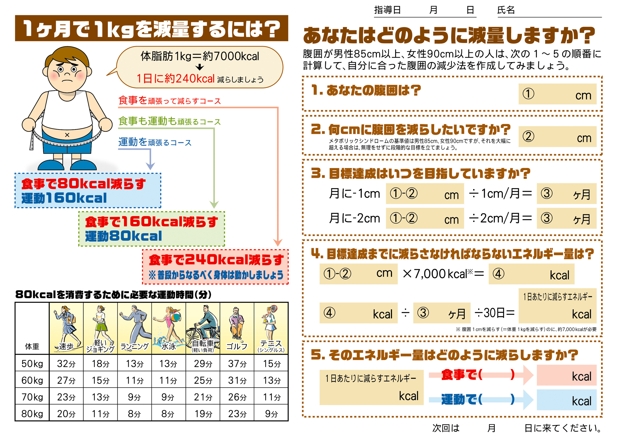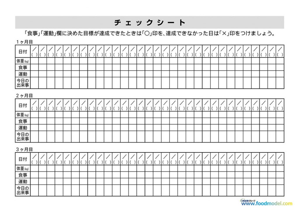 減量指導の目標設定をして対象者に配布すると、裏面のチェック欄で自己評価を記入してもらえるシートになっています。 肥満者への指導、特定保健指導での減量指導など・・・、様々にご活用いただけます。