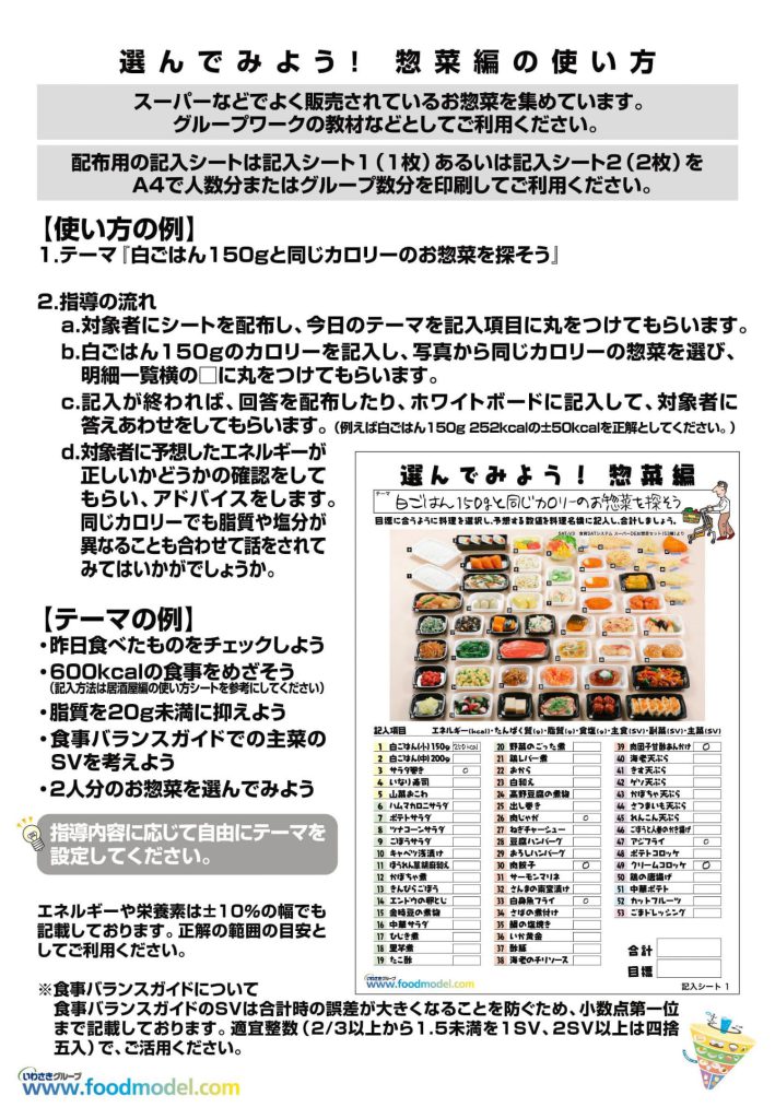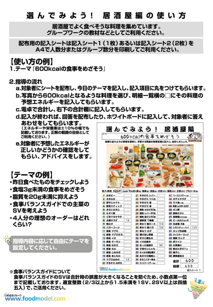 保健指導や臨床での指導など、居酒屋メニューやお惣菜をテーマにしたグループワークなどの栄養指導でご活用いただけます。
