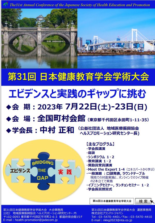 7月22日(土) ~ 7月23日(日)に全国町村会館(東京都千代田区)で開催されます「第31回日本健康教育学会学術大会」の企業展示に出展いたします。ご参加の折には弊社ブースまでお立ち寄りください。