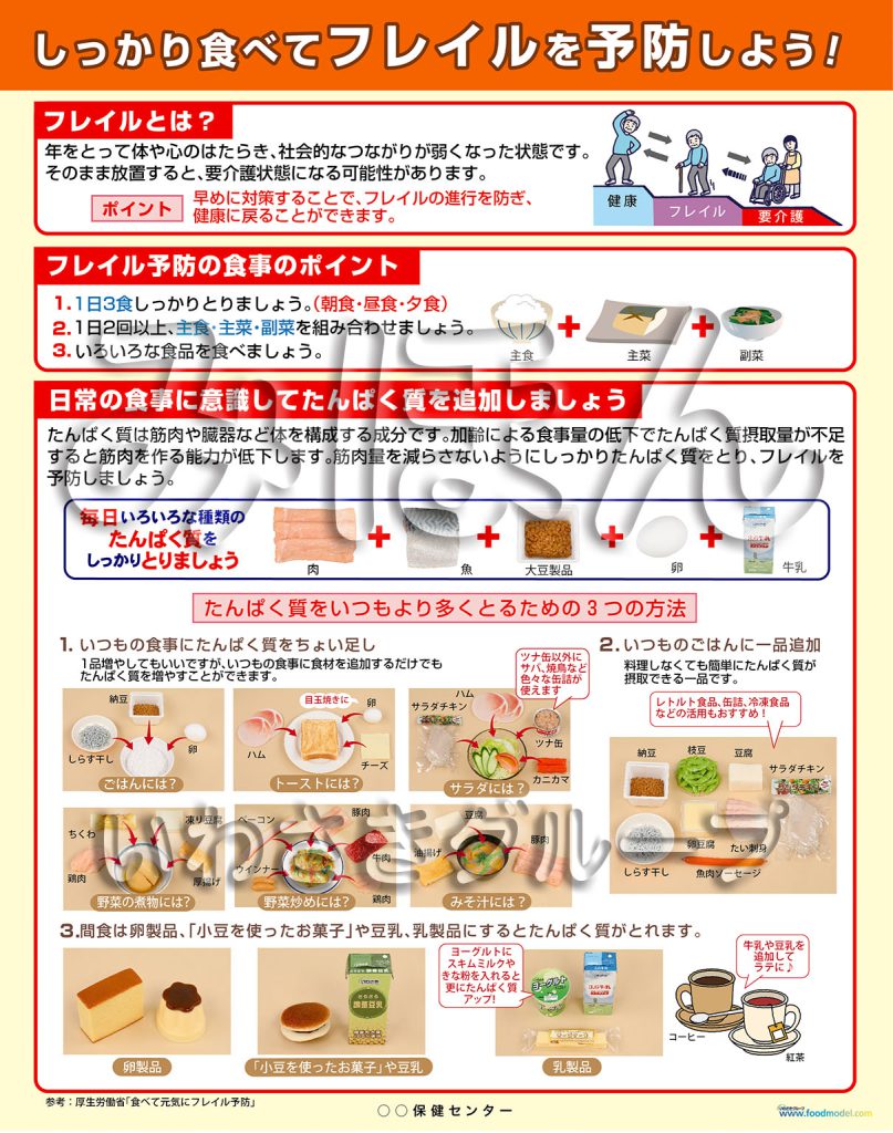 AS-2 フレイル予防のためのたんぱく質指導フードモデルに対応しておりますので、フードモデルと合わせてお使いいただくと効果的です。待合室や栄養指導室などへの展示にご活用ください。