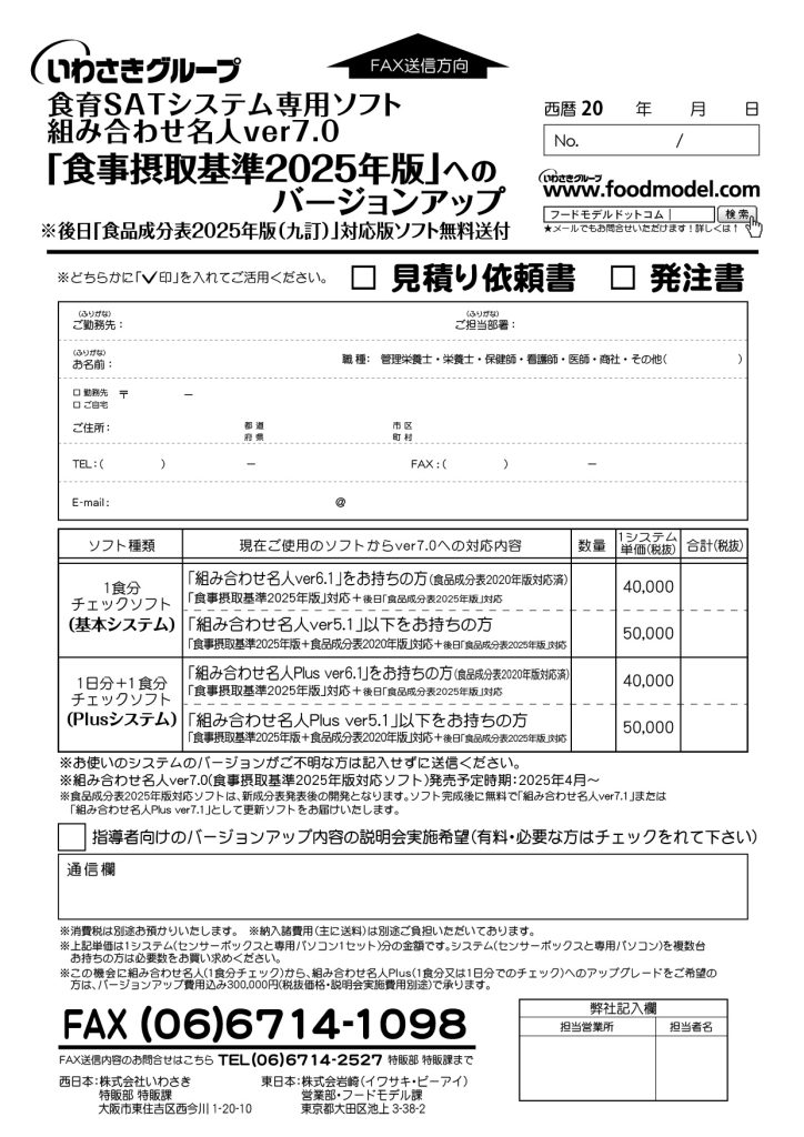 ※今回のお申込みには、以後発表予定の「日本標準食品成分表2025(九訂)」対応の『Ver.7.1』のバージョンアップも含まれています。対応時期は未定ですが完成次第、お送りさせていただきます。